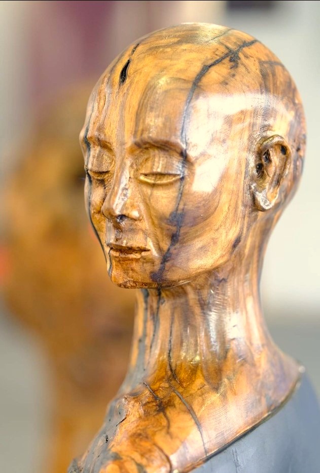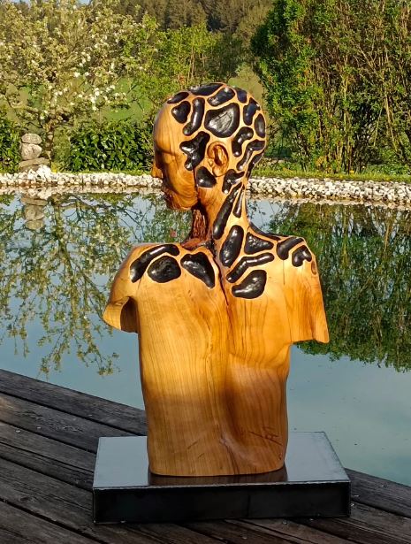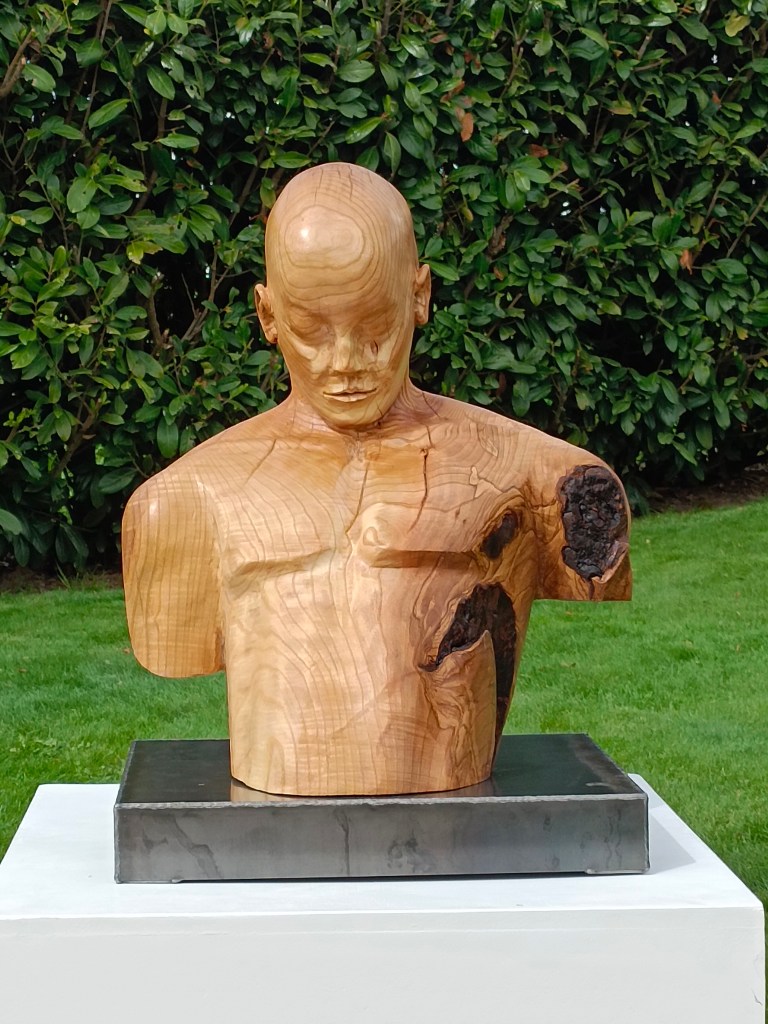 BÜSTE ESCHE; ESCHENHOLZ GEÖLT AUF STAHLSOCKEL CA. 50 CM HÖHE – OVERKAUFT – SOLD