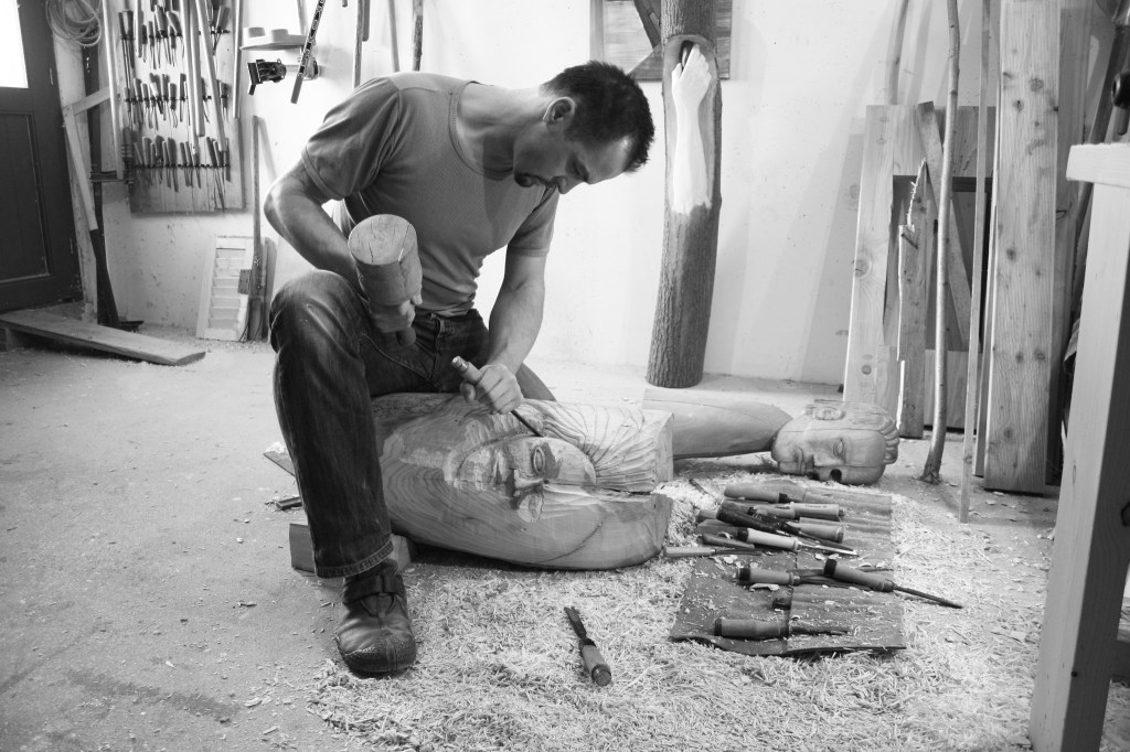 Jede der Skulpturen ist aus heimischen Stämmen gearbeitet. Diese Stämme sind lebendige Geschichte da sie zum Teil über 100 Jahre alt sind.